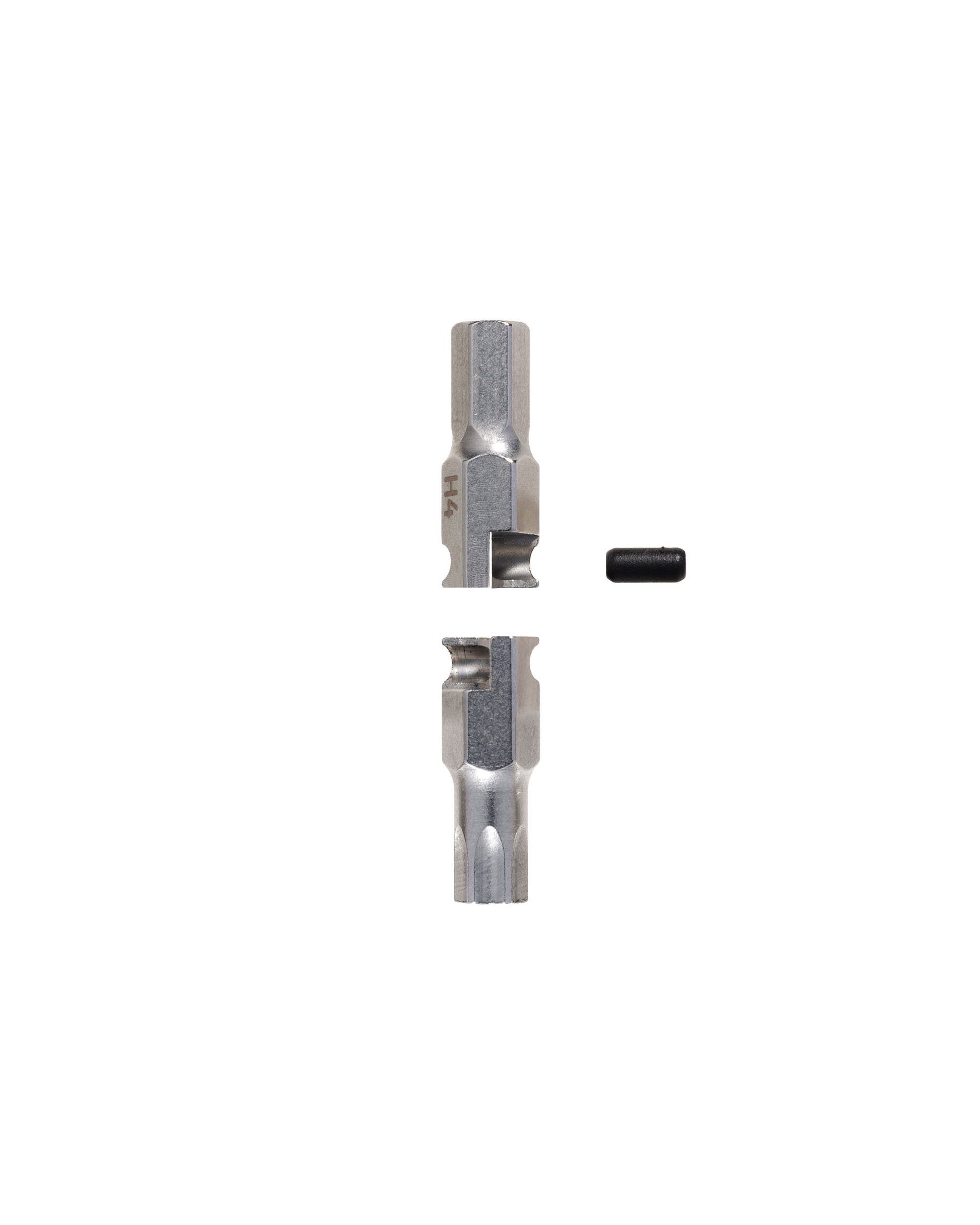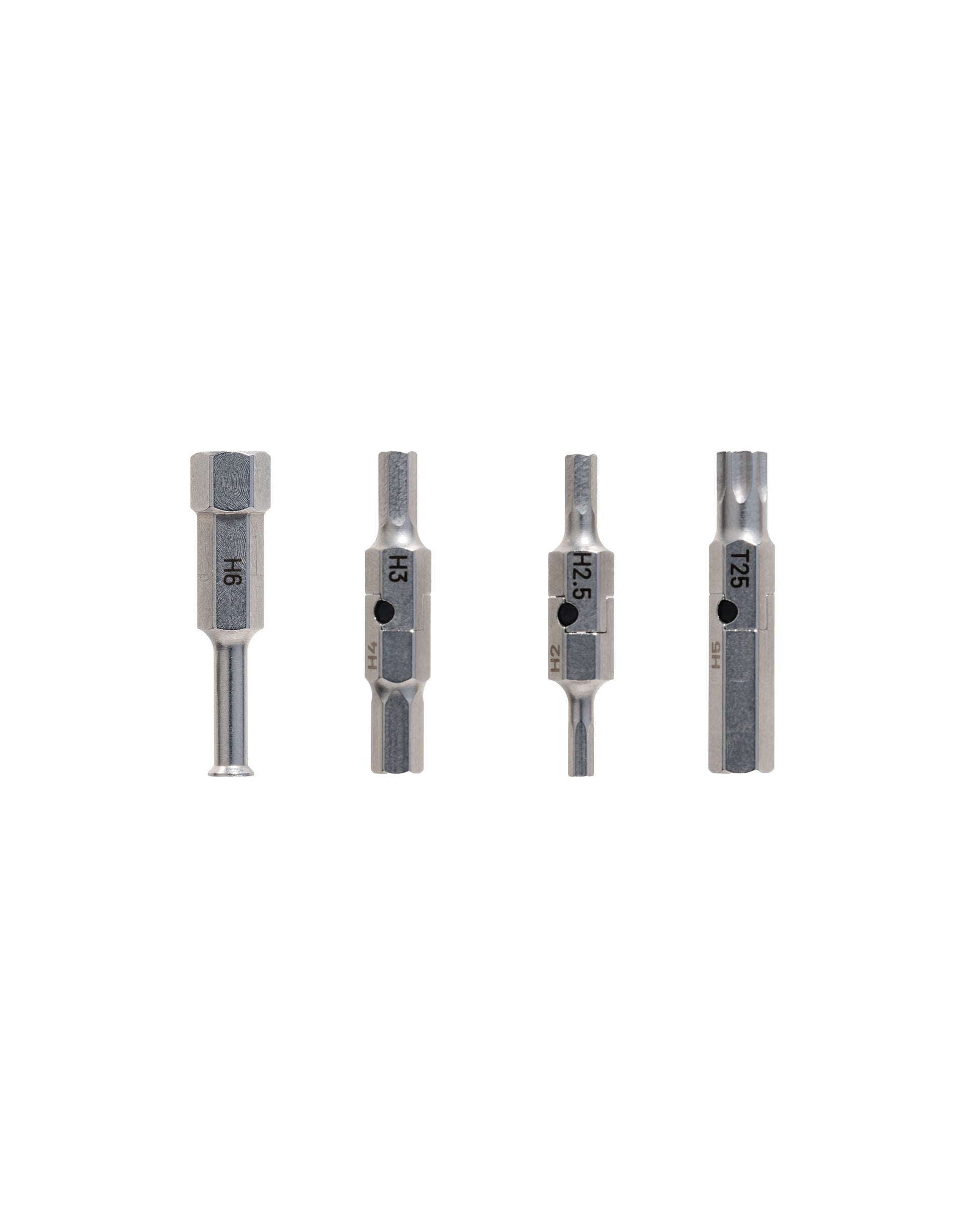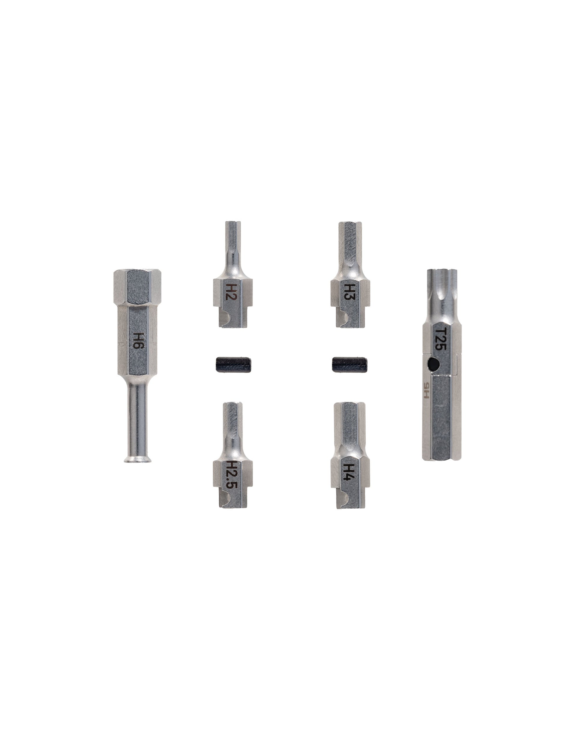 The IncredibleX comes with 8 tools: HEX 2, 2.5, 3, 4, 5, 6, 8 (integrated in the tool) and T25. The new, double-sided bits can be freely configured to your needs with the patented lock-interface, which holds the bits rock solid together. So whatever components you have or might have in the future, you can adapt the Incredible X to your requirements. The following bits are available as add-ons: T10, T15, T20, T30, Plus (JIS), Flat head.