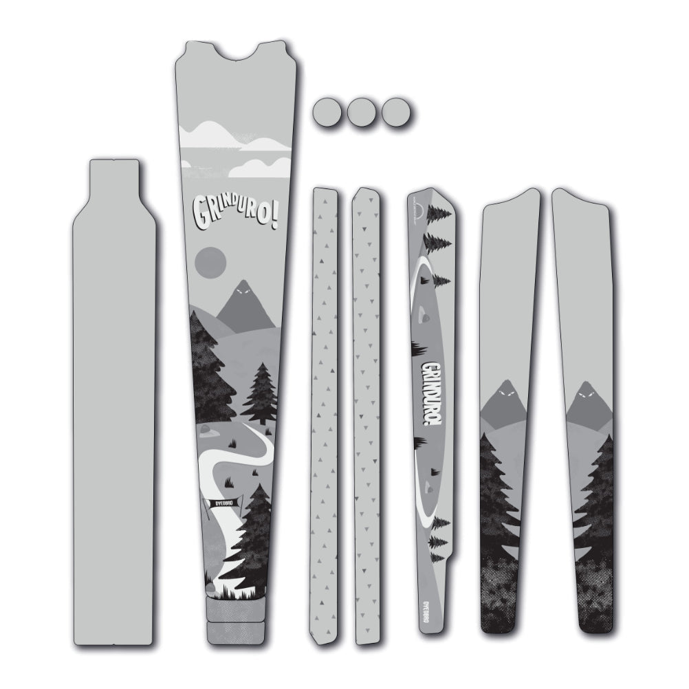 We are sponsors of Grinduro and have ridden at various events over the years - this kit uses the Grinduro illustration in purple or black to give those party-to-ride ratio vibes on your bike.