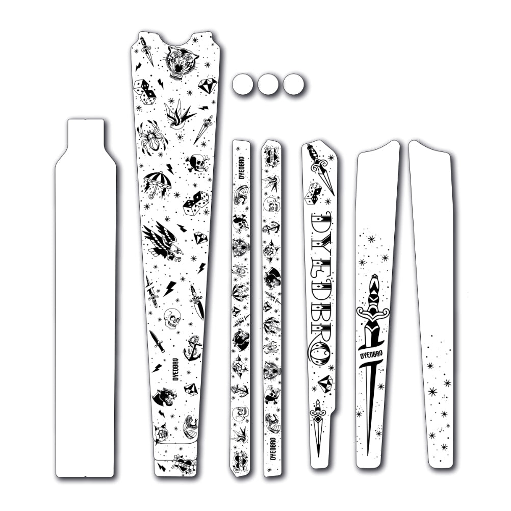 Old school tattoo or traditional American tattoo is a style featuring bold black outlines and a limited color palette. We think tattoos are cool and your bike would look cooler with some on. This is why we created this design, to bring some of that tattoo culture to the bike world.