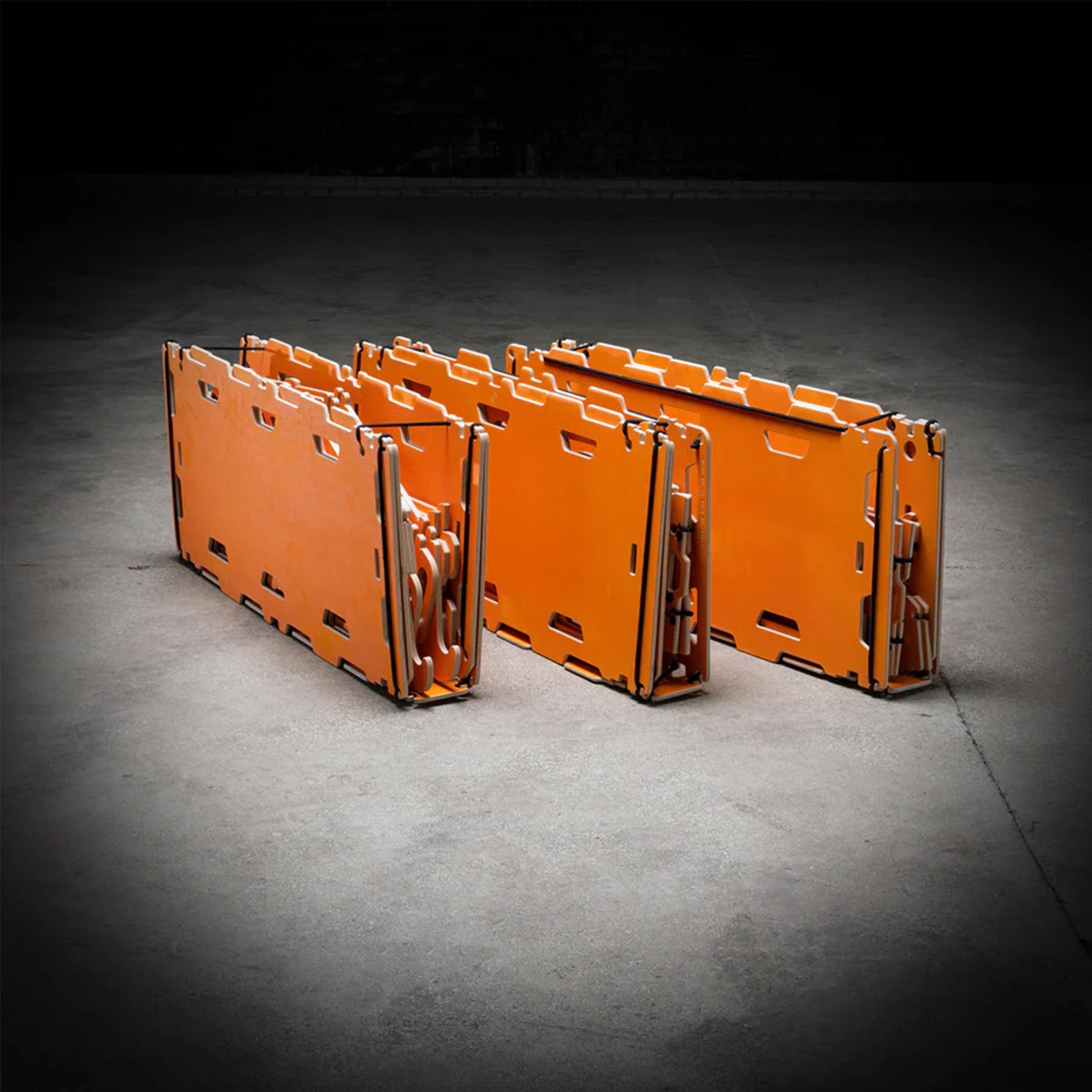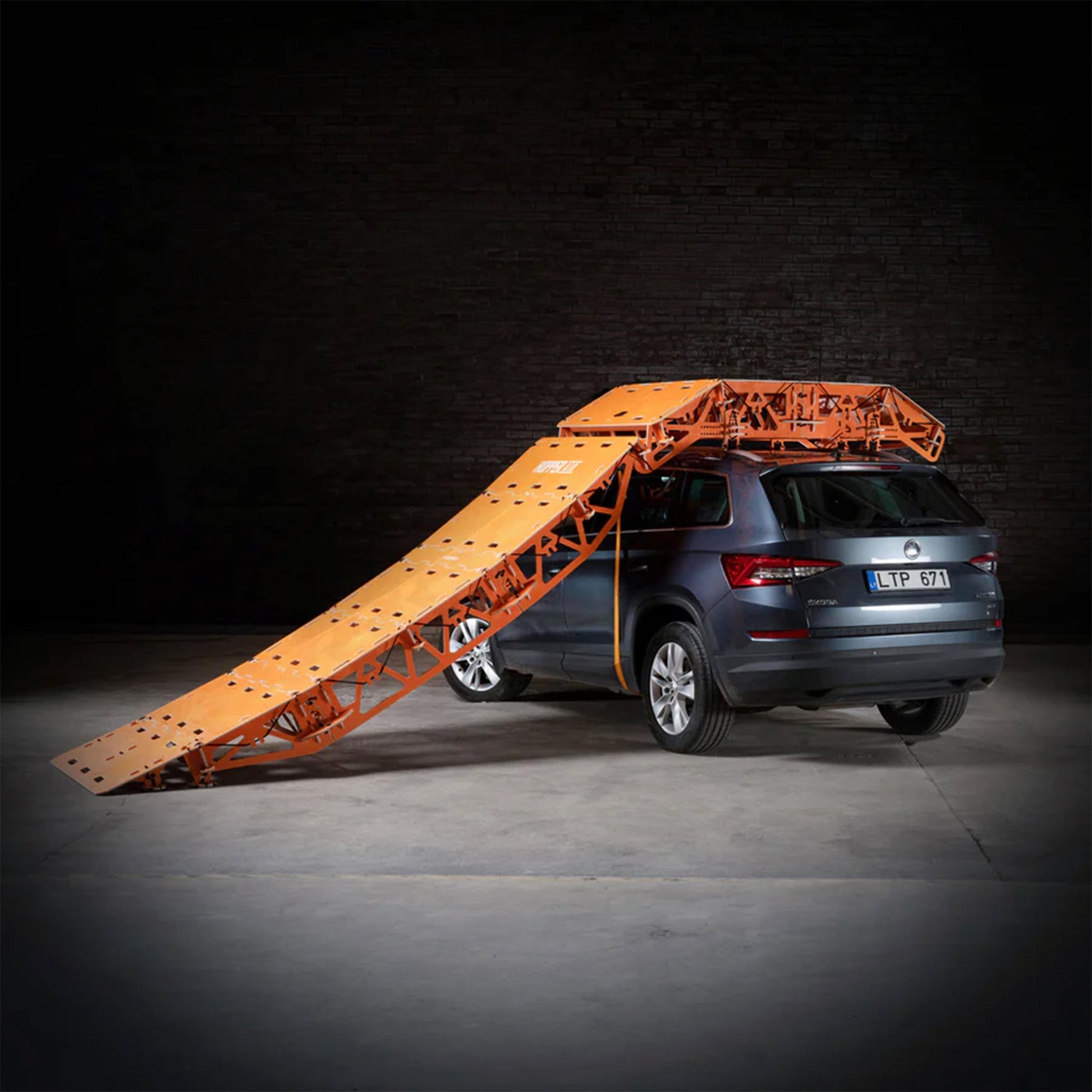 Air land is composed of three briefcases, which are assembled into two main parts: table top and slope. Land can be mounted on the roof of any regular car, if it has car roof rails. If mounted on the roof of the car, the minimal height of the car is 1,4 m and the maximum is 1,8 m. There is also a possibility to assemble the land in the grassland or any other place which does not have concrete (it cannot be used on concrete, requires soft ground for strap poles) with our one legged stand - Pirate.