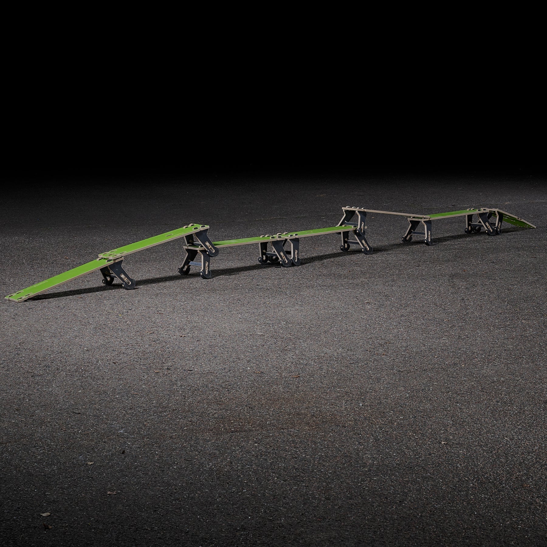 - Separate modules can be arranged in a straight line or with turns, with surfaces that can be flat or pump track style.